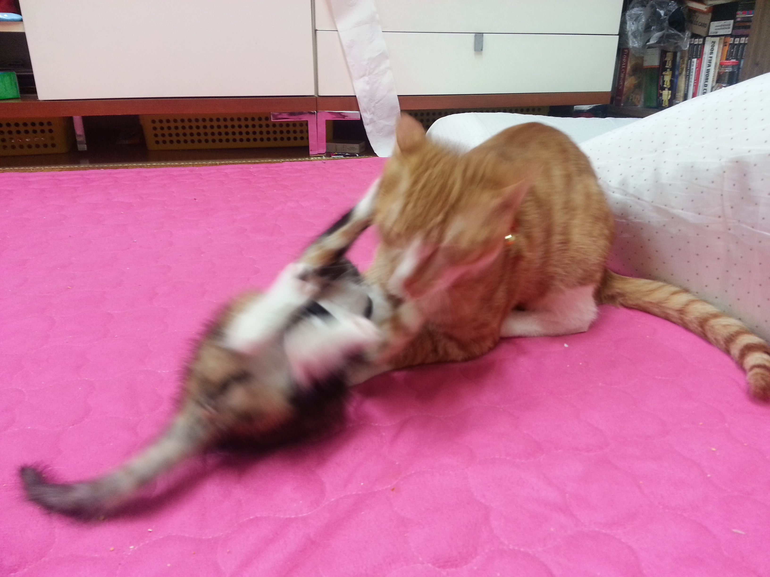 반응은 예상보다 훨씬 거칠었습니다. 낮은 으르렁거림, 날 선 하악질, 그리고 사료까지 빼앗아 먹는 모습에 마음이 아팠습니다. 밤송이는 한참을 굶다시피하며 구석에 웅크려 있곤 했습니다. 그런 와중에도 밤송이는 묵묵히 밤톨이 곁을 맴돌았고, 그의 행동을 지켜보며 작은 용기를 내 다가갔습니다.