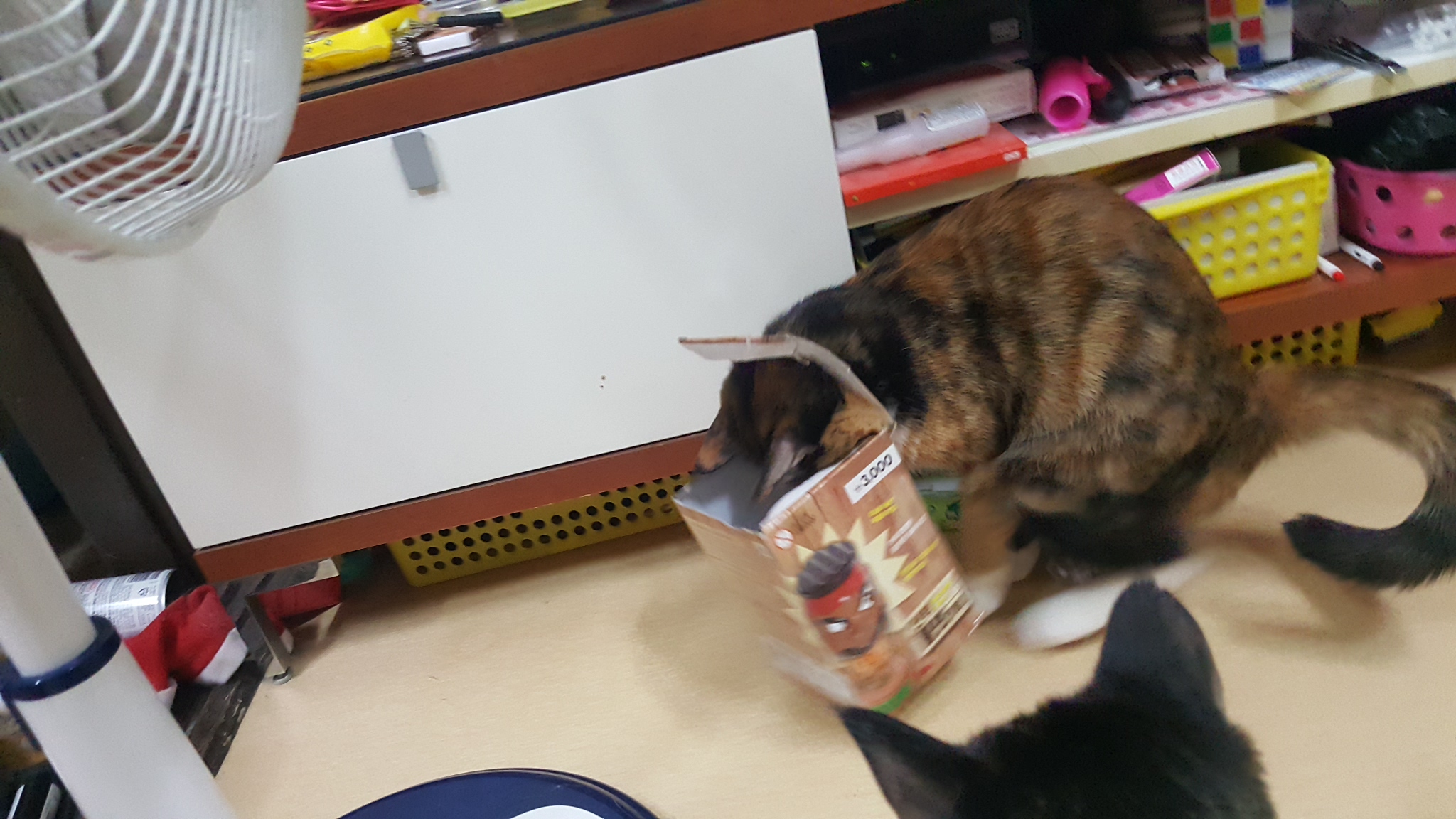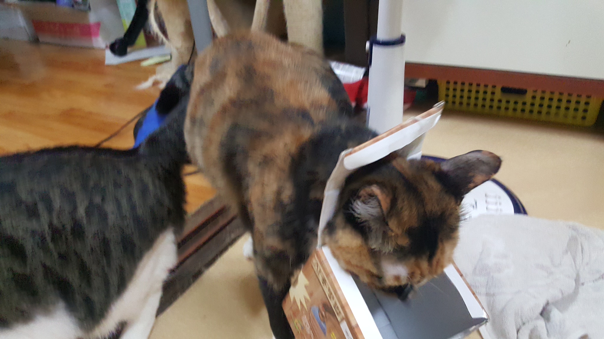 밤송이는 당황한 기색이 역력했다. 박스가 몸에 걸리자, 그걸 떼어내기 위해 이리저리 온 집안을 뛰어다녔다. 박스를 머리에 두른 채로 방향 감각을 잃은 듯 가구 사이를 헤매고, 가끔은 제자리에서 빙글빙글 돌기도 했다. 그 모습은 안쓰러우면서도 어찌나 웃기던지, 나도 모르게 폭소를 터뜨리고 말았다.