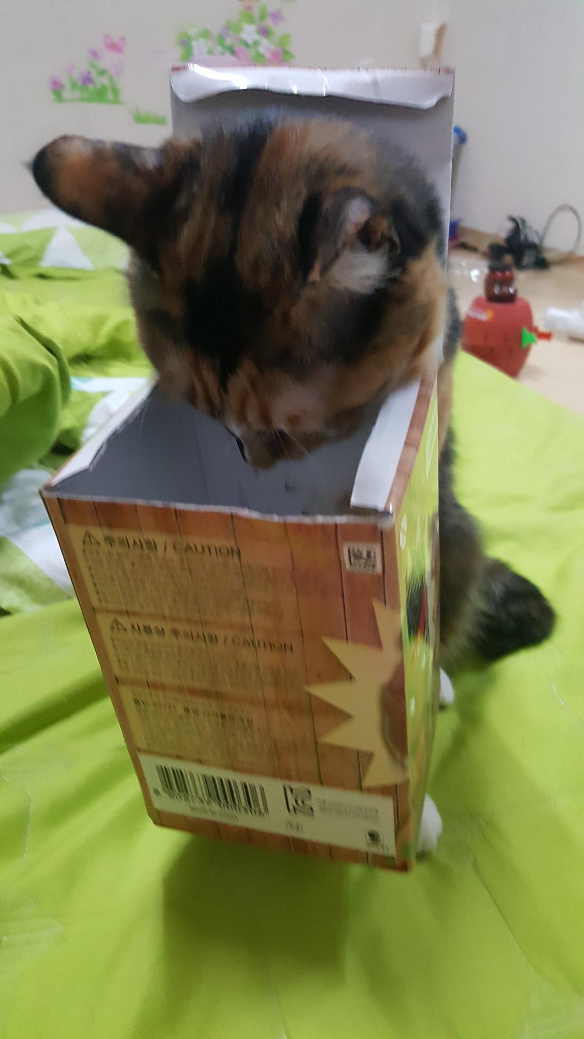 그 순간은 다시 오지 않는다. 고양이의 예측 불가능한 사고력과 행동은 늘 카메라에 담기기 어렵기에, 이런 찬스를 놓칠 수 없었다. 나는 최대한 빠르고 조용하게 움직이며 각도별로 사진을 남기기 시작했다. 박스를 머리에 끼운 채 엉거주춤 서 있는 밤송이, 박스를 흔들며 탈출을 시도하는 밤송이, 결국 지쳐 멈춰 선 밤송이까지. 사진첩엔 ‘박스냥이의 하루’가 빠르게 완성되어갔다.