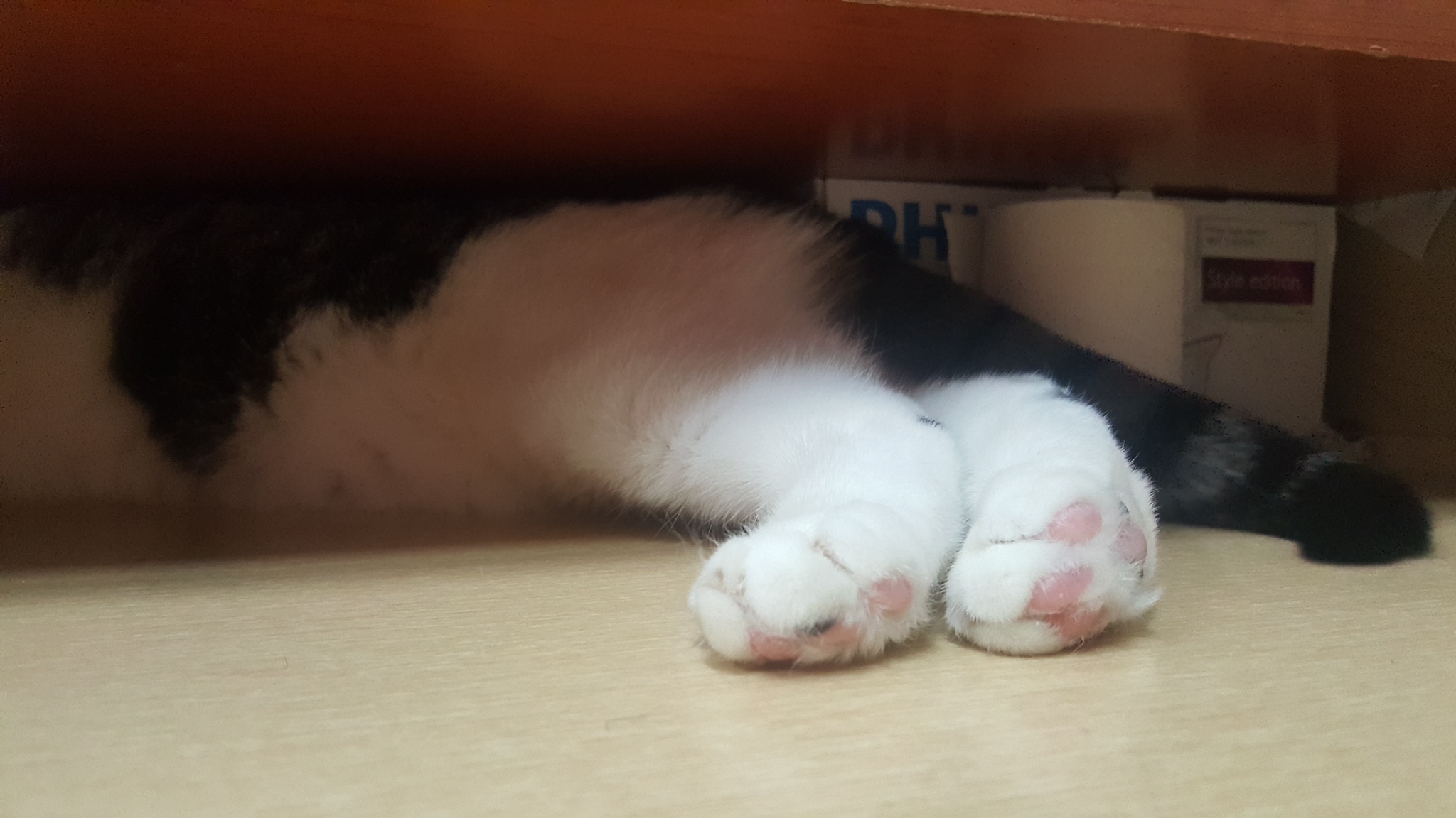 머리부터 조심스레 집어넣고, 어깨와 몸통을 비틀어가며 조금씩 안으로 파고든다. 마지막엔 작은 궁뎅이가 쏙 들어가며 완전히 자리 잡는다. 그 장면을 지켜보고 있으면, 마치 마술처럼 고양이가 작은 서랍 속으로 사라지는 것 같다.